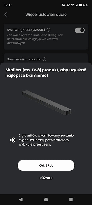 Po instalacji możemy przeprowadzić kalibrację belki do akustyki naszego pomieszczenia. Proces kalibracji jest prosty, zautomatyzowany i trwa kilkadziesiąt sekund.
