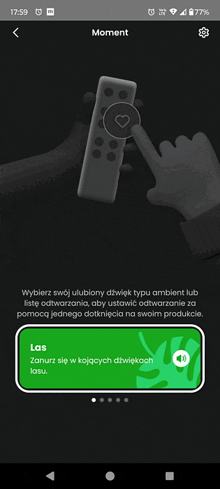 A teraz czas na ciekawostkę. Otóż JBL 300MK2 ma na pilocie „serduszko”, które uruchamia funkcję zwaną „moment”. Są to krótkie „scenki dźwiękowe”, które umilą nam np. lekturę ulubionej książki lub czasopisma. Do wyboru jest kilka opcji, w tym las, deszcz czy ocean. Możemy też ustawić w aplikacji naszą ulubioną playlistę. Moim zdaniem to bardzo fajne!