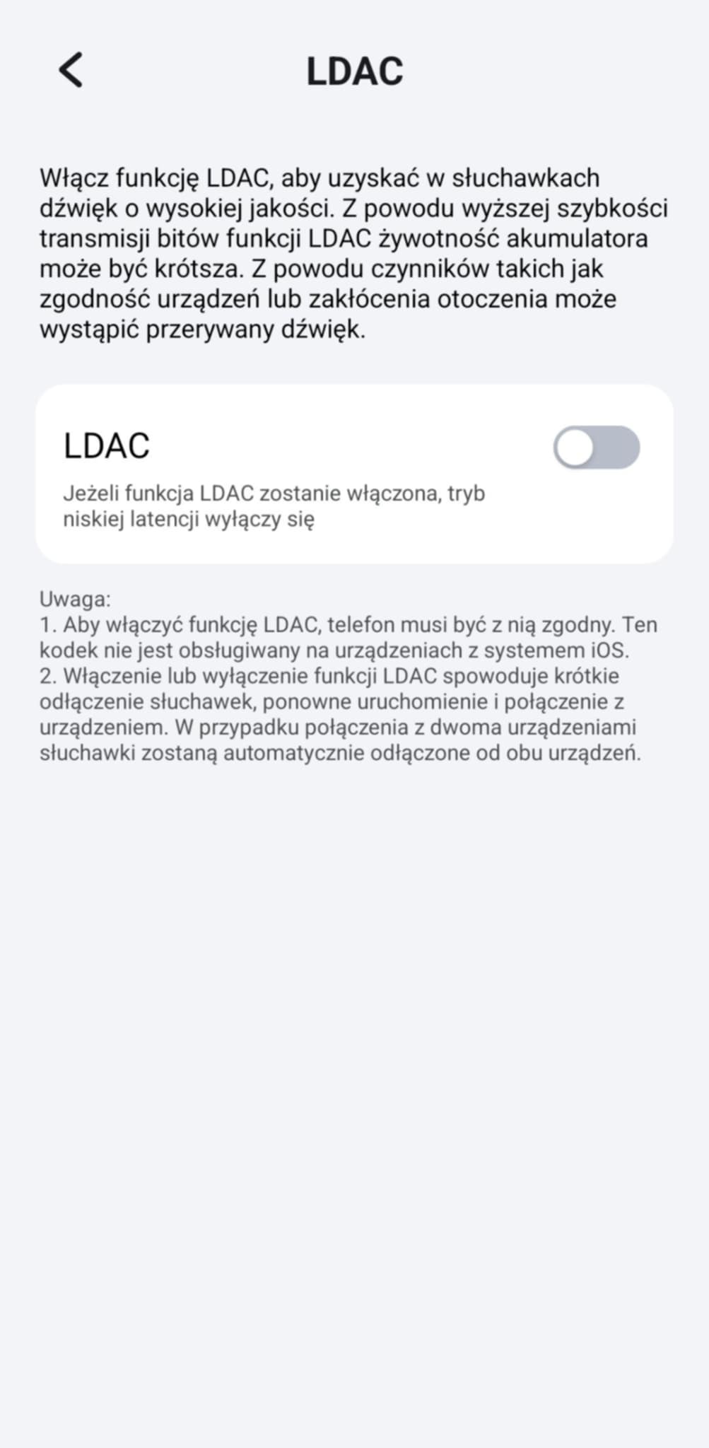 Jeśli korzystasz z Tidala/Apple Music/Amazon Music w wersjach hi-res albo masz własne pliki wysokiej jakości — możesz włączyć LDAC. Pamiętaj o dwóch rzeczach: LDAC jest bardziej prądożerny niż AAC/SBC oraz w aplikacji streamingowej warto upewnić się, że kodowanie jest faktycznie ustawione na jakość, a nie „auto”. Natomiast przy odtwarzaniu niższych jakości (np. Spotify) nie ma to większego znaczenia w codziennym odsłuchu.