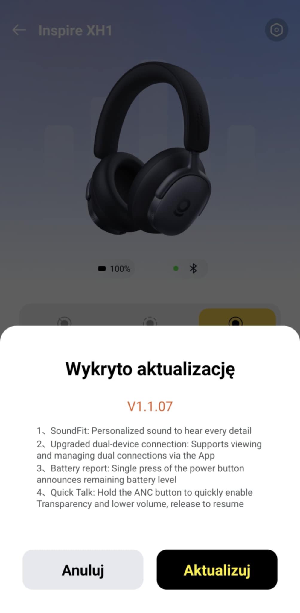 Dla użytkownika oznacza to, że XH1 można „ustawić pod siebie” – zarówno pod kątem tonalnym, jak i „mocy” ANC – bez przepinania słuchawek z telefonu do laptopa i z powrotem.