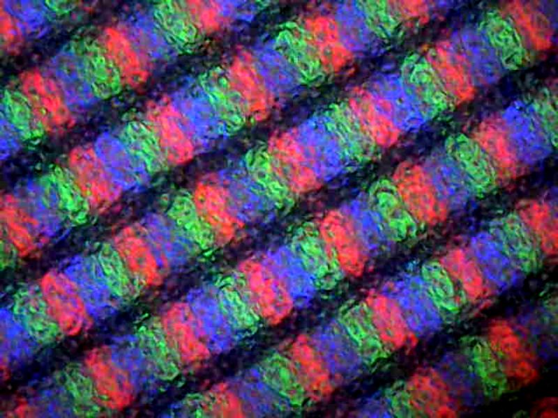 Pod mikroskopem widać, że struktura subpikseli jest rozmyta, a to z powodu zastosowania matowego, rozpraszającego światło filtra ekranowego. Filtr ten w dużym stopniu ogranicza odblaski, co z pewnością docenią użytkownicy korzystający z telewizora w jasnych pomieszczeniach.