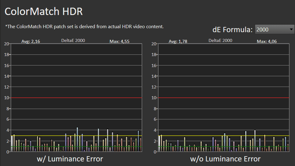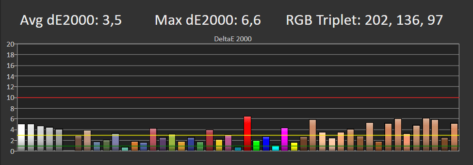 W lekko ocieplonym (tj. wykazującym nadmiar składowej czerwonej 5882K) trybie Filmmaker średni błąd odwzorowania kilkudziesięciu testowych próbek barw wyniósł 3,5, czyli nieco powyżej progu postrzegalności (3,0).