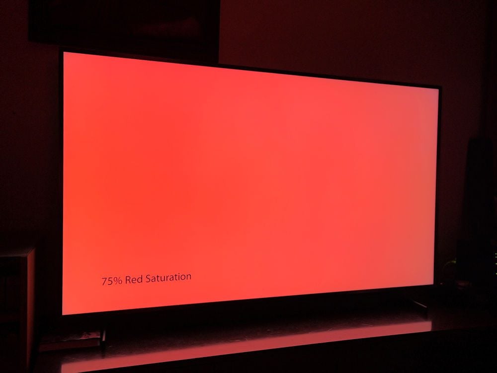 Pod kątem w poziomie kolory nieco ciemnieją i bledną — w sposób typowy dla matryc VA. Na poniższym zdjęciu 75-procentowa czerwień przy prawej krawędzi ekranu jest trochę bardziej nasycona niż w rzeczywistości, ale nie udało mi się tego lepiej uchwycić.