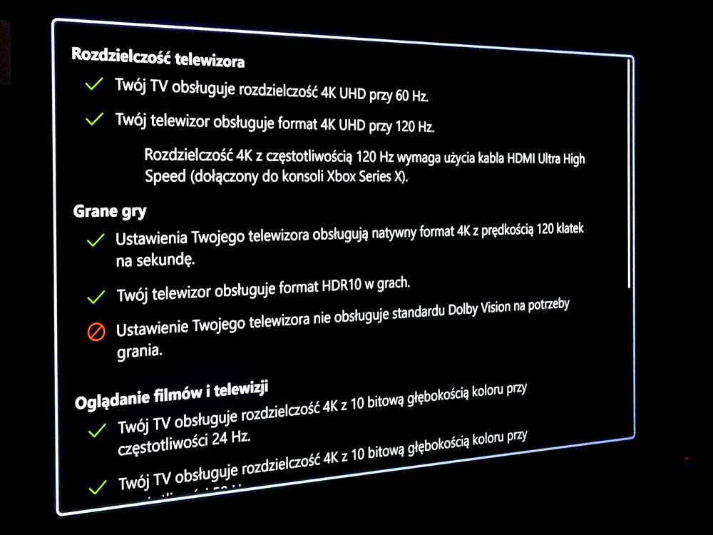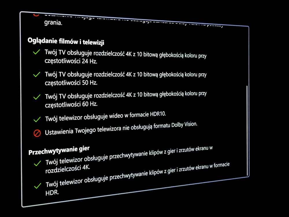 Z kolei konsola Xbox Series X podłączona do testowanego telewizora tak oceniła go pod kątem możliwości współpracy: