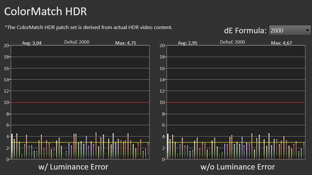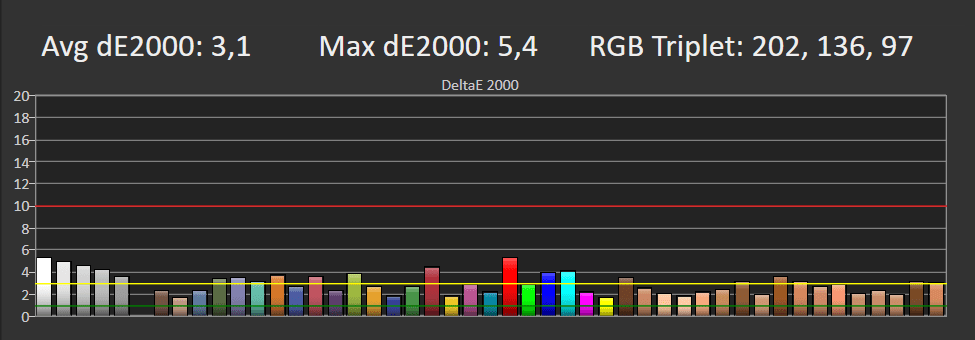 W lekko ocieplonym (tj. wykazującym nadmiar składowej czerwonej 5951K) trybie filmmaker średni błąd odwzorowania kilkudziesięciu testowych próbek barw wyniósł 3,1, czyli niemal na progu postrzegalności (3,0).