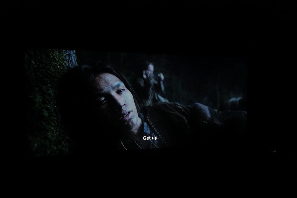 W ustawieniach fabrycznych trybu filmmaker nasza standardowa scena z filmu Zjawa (The Revenant, 2015, HDR10) wypadła raczej słabo — sporo detali zostało wchłoniętych przez wszechobecną czerń.