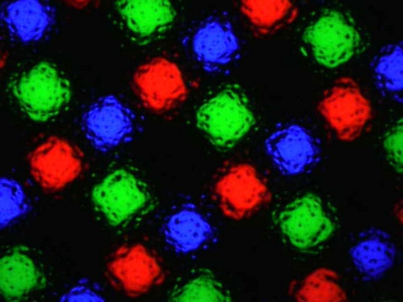 Samsunga 65S95F wyposażono w wyświetlacz QD-OLED wyprodukowany przez Samsung Display. Tego rodzaju wyświetlacz nie ma „tradycyjnych” filtrów koloru (jak w WOLED-ach czy telewizorach LCD); zamiast tego za konwersję światła niebieskiego odpowiadają skupiska czerwonych i zielonych kropek kwantowych, nałożonych metodą natryskową (ang. inkjet printing). To właśnie technologia natryskowa i wynikający z niej ruch dyszy wymuszają taki, a nie inny układ subpikseli – odmienny od reszty telewizorów na rynku.