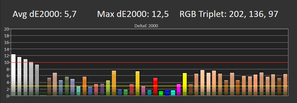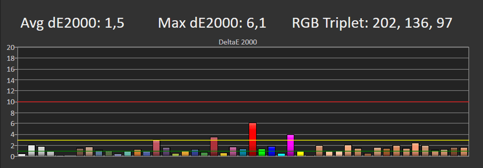 Po szybkiej dwupunktowej kalibracji balansu bieli średni błąd spada do 1,5, co jest znakomitym wynikiem.