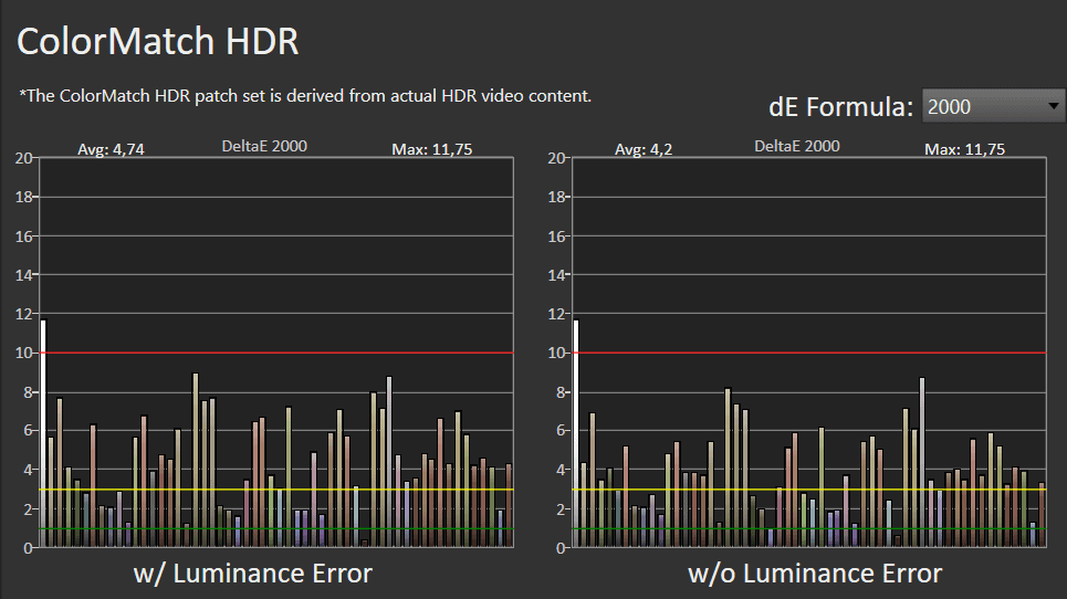 Mierzone powierzchniowo pokrycie przestrzeni UHDA-P3 (CIExy) wyniosło 100% (słownie: sto procent), co jest znakomitym wynikiem i potwierdza możliwość wyświetlania bardzo szerokiej palety barw. Z kolei średni błąd odwzorowania barw w trybie HDR (przy MaxCLL = 1000; MaxFALL = 400 cd/m²) wyniósł 4,7, co można uznać za dość dobry wynik.