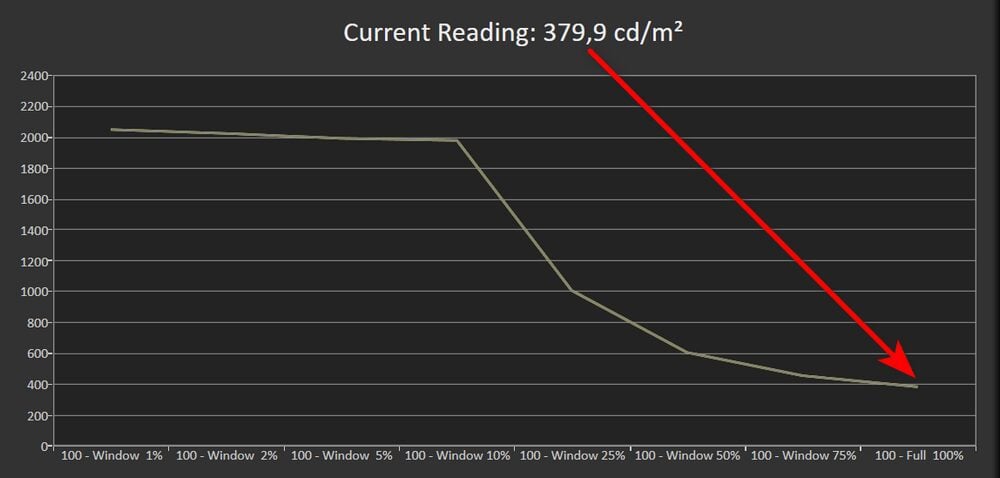 Na pełnym ekranie zmierzyłem luminancję równą 380 cd/m², co – jak na OLED-a – jest znakomitym wynikiem (mówimy o pełnoekranowej białej planszy, podczas wyświetlania której OLED-y pracują na granicy swoich możliwości).