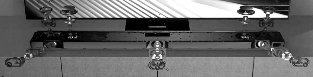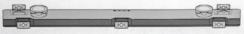 Zwracam uwagę, że w ww. układzie trzy przetworniki przednie są lekko pochylone do tyłu, ponieważ po zmianie położenia belki, tj. w układzie pionowym, ich funkcja się zmieni, a pochylenie ma zapewnić odpowiednią dyspersję dźwięku w obu położeniach.