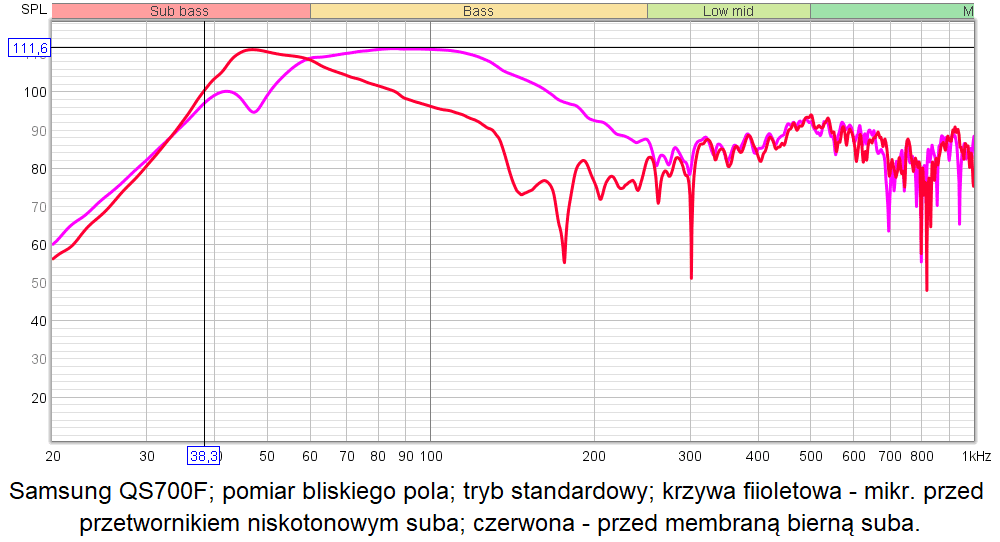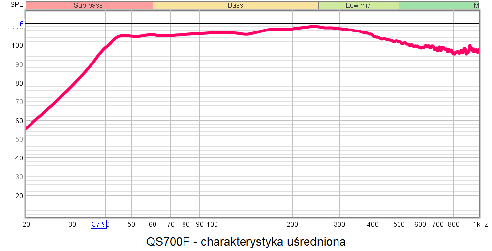 Jak widać z wykresów, w QS700F nie mamy szczytu w okolicach 47 Hz, lecz bardzo ładne, liniowe rozciągnięcie do ok. 38 Hz.