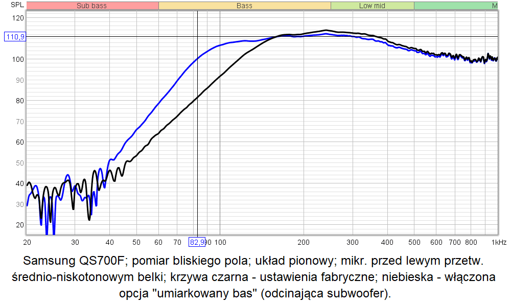Ale to jeszcze nie koniec basowych niespodzianek. QS700F ma funkcję „umiarkowany bas”, która po prostu odcina subwoofer – i wtedy całe zadanie reprodukcji niskich tonów spada na belkę. Radzi sobie ona z tym nieźle: sama belka schodzi do ok. 120 Hz, a z funkcją „umiarkowany bas” – wyraźnie niżej. Inaczej mówiąc, procesor belki inaczej ustawia częstotliwość odcięcia (podziału) dla zestawu belka + sub, a inaczej dla samej belki.
